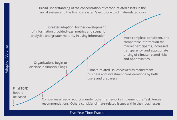 The TCFD has outlined a five-year time frame for market adoption of its recommendations, as shown below. The time frame accounts for the process of year on year development and experimentation by reporting entities, which results in “More complete, consistent, and comparable information for market participants…” and finally a “Broad understanding of the concentration of carbon-related assets in the financial system and financial system’s exposure to climate-related risks”. Committed companies are expected to keep this pathway in mind as they implement the TCFD’s recommendations.