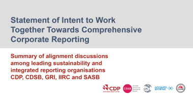 In response to this, five framework- and standard-setting institutions of international significance, CDP, the Climate Disclosure Standards Board (CDSB), the Global Reporting Initiative (GRI), the International Integrated Reporting Council (IIRC) and the Sustainability Accounting Standards Board (SASB), have co-published a shared vision of the elements necessary for more comprehensive corporate reporting and a joint statement of intent to drive towards this goal – by working together and by each committing to engage with key actors, including IOSCO and the IFRS, the European Commission, and the World Economic Forum’s International Business Council.