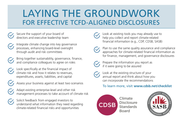 Ahead of the launch of the "TCFD Implementation Guide", CDSB and the Sustainability Accounting Standards Board (SASB) have published a checklist to help you prepare for effective TCFD-aligned disclosures.