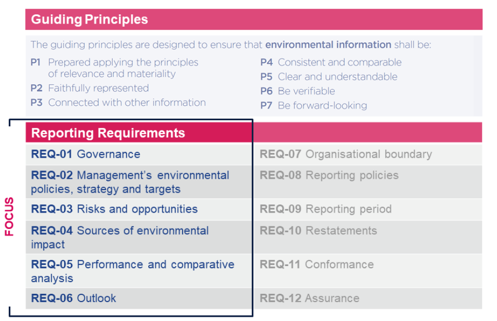 The focus of the guidance is on the first six reporting requirements of the CDSB Framework (REQ-01-06)